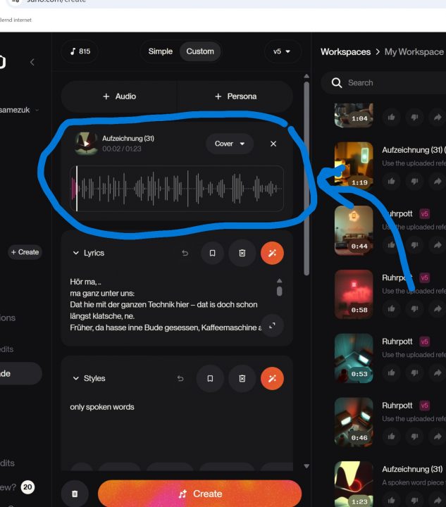 Ich habe anfangs hier viel herumprobiert und zu sehr auf „die KI“ vertraut – dann klingt es schnell wieder nach Standard-Preset. Mit hoher Audio Influence und klarer Style-Vorgabe bekomme ich inzwischen deutlich konsistentere Resultate.